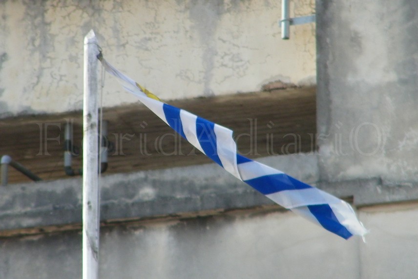 Las banderas del edificio comunal se encontraban este lunes en estado deplorable. El Pabellón Nacional y la Bandera de Florida, que se encuentran sobre el viejo edificio de la «Junta Económica Administrativa» -tal su antigua denominación – estaban, uno pendiendo de un hilo y la otra enredada.