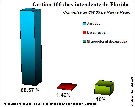 El comparativo que consulta sobre la gestión del jefe comunal en el centenar de jornadas, indica que Carlos Enciso, tiene una aprobación del 88.57 % de acuerdo a los porcentajes sobre la base de datos que da a conocer la emisora entre lunes y sábado.