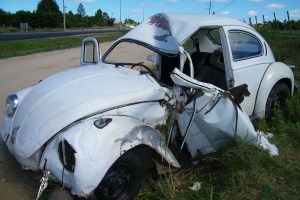 wolskwagen fusca contra una columna de Ute. El conductor zigzagueó