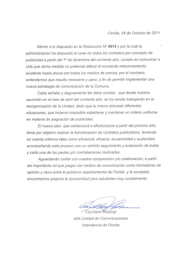 Comunicaciones solicitó “comprensión” por cese publicitario Fecha: 29/10/2011Autor/a: FD 0 Comentarios En la carta enviada a los medios, el director de la repartición explica los motivos del recorte y aclara que no se pretende alterar el excelente relacionamiento. Lea el documento: COMPARTE! Comparte en Facebook (Se abre en una ventana nueva) Facebook Compartir en WhatsApp (Se abre en una ventana nueva) WhatsApp Compartir en X (Se abre en una ventana nueva) X Compartir en LinkedIn (Se abre en una ventana nueva) LinkedIn Compartir en Telegram (Se abre en una ventana nueva) Telegram Imprimir (Se abre en una ventana nueva) Imprimir Me gusta Cargando... Relacionado