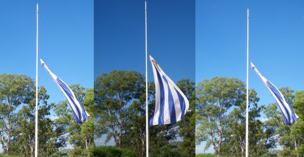 Durante varias horas la bandera estuvo, por decirlo de alguna manera, “quasi” a “media asta”, enredada en todo momento e “intentando” flamear pese a su posición.
