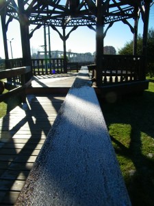 Una pérgola de madera en el acceso a la ciudad de Florida, también amaneció blanco. Foto: FD Fecha: 09/06/2012Autor/a: FD 0 Comentarios Una pérgola de madera en el acceso a la ciudad de Florida, también amaneció blanco. Foto: FD