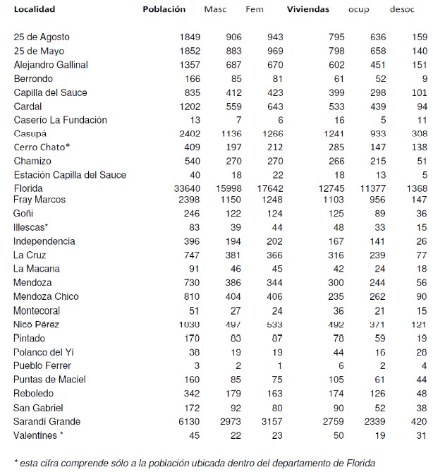 Somos menos que hace ocho años. Era sabido desde que se desnudaron los datos primarios. Ahora está ‘oficialmente confirmado’. Somos 1133 menos. La tasa anual media de crecimiento del departamento de Florida se calcula en -0,23 según los datos finales del censo 2011, que fueron dados a conocer el pasado viernes por el Instituto Nacional de Estadísticas. La tasa anual de crecimiento natural de Florida (2,90) es la tercera más baja del país, detrás de Lavalleja (1,43) y Rocha (2,79).