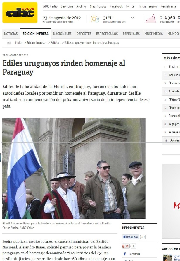 Además de decenas de comentarios de uruguayos y paraguayos en el portal floridense, el diario ABC Color dio a conocer la noticia de lo que calificaron como un “homenaje” del edil Alejandro Bauer al montar con la bandera de Paraguay en el reciente desfile de Los Patricios.