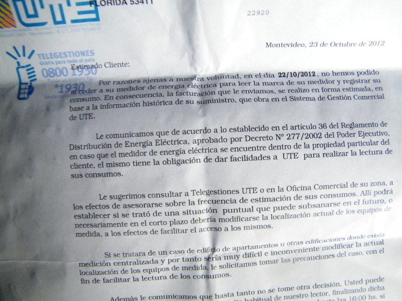 El motivo no es claro, pero la UTE lo reconoce. “Desde el día 22/10/2012 no hemos podido acceder a su medidor de energía (…) en consecuencia, la facturación que le enviamos, se realizó en forma estimada”, comienza señalado el escrito dirigido al “Estimado cliente” al cual accedió FloridAdiariO.