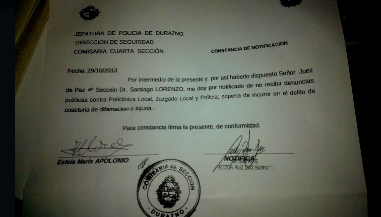 Según la nota escrita que le llegó a una periodista del lugar, el juez de Paz del poblado Villa del Carmen le indicó a la periodista que no podía recibir denuncias acerca de Policlínica Local, Juzgado y Policía, “so pena de incurrir en el delito de coautoría de difamación e injurias”, tal como denunció el programa Alternativa Durazno a través de su cuenta de Twitter.