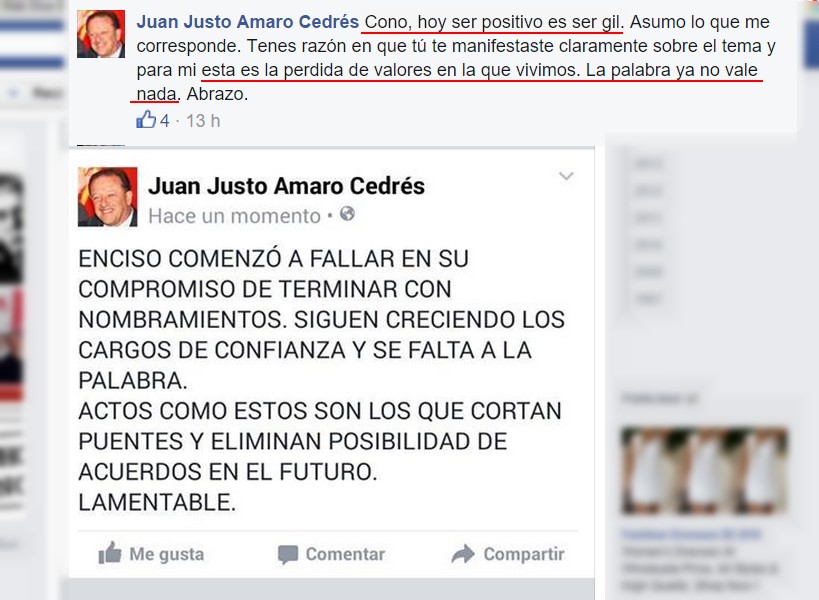 “Cono, hoy ser positivo es ser gil. Asumo lo que me corresponde. Tenes razón en que tú te manifestaste claramente sobre el tema y para mi esta es la perdida de valores en la que vivimos. La palabra ya no vale nada”, respondió Amaro a un militante en las redes sociales.