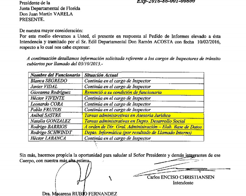 De acuerdo al escrito, 11 cargos de inspectores de tránsito fueron cubiertos en 2013 luego de un llamado realizado el día 3 de octubre de ese año.