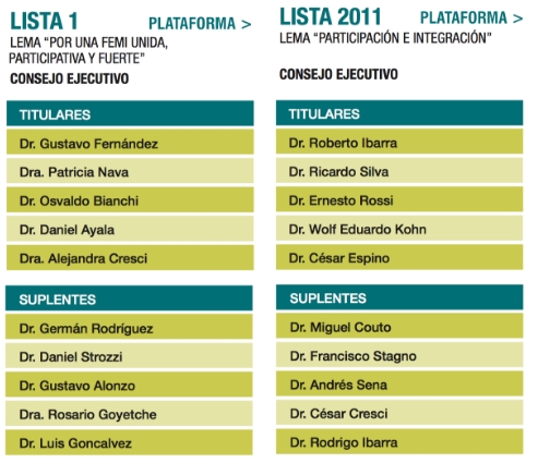 Hay 4 listas: la 1 (integrada entre otros por el médico floridense Dr. Daniel Ayala) y la 2011 para el Consejo Ejecutivo, y la 11 y 201 para la Comisión Fiscal.