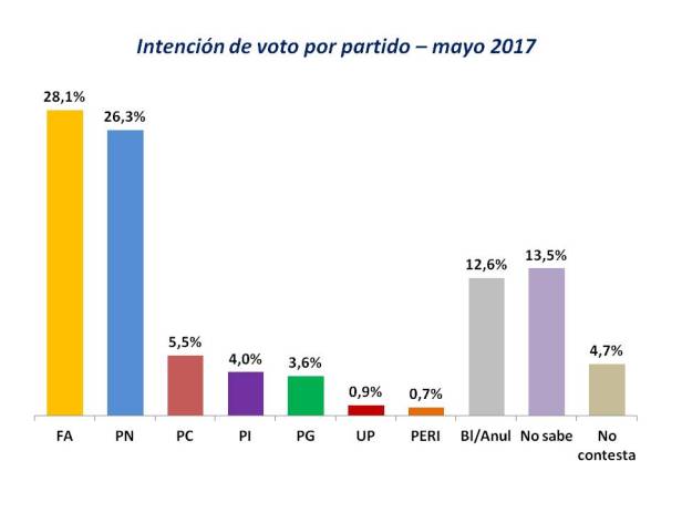 El voto en blanco o anulado es de 12,6%, no sabe a que partido votará 13,5% y no quiso responder un 4,7%.