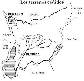 La primera reducción territorial se impone por Ley el 14 de julio de 1873. Florida cede a Durazno una franja de territorio a fin de facilitar la ampliación, hacia el sur, del ejido de la ciudad capital de ese departamento.