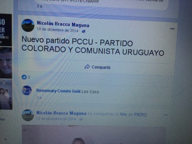 Aquí constatamos cómo a NICOLÁS BRACCO MAGUNA le caen tan mal las personas no heterosexuales, así como las personas comunistas. De paso, parece que los colorados tampoco son de su simpatía. Bromea con el PCCU: «PARTIDO COMUNISTA COLORADO DEL URUGUAY». Y una amiga le festeja: «Los coco.»