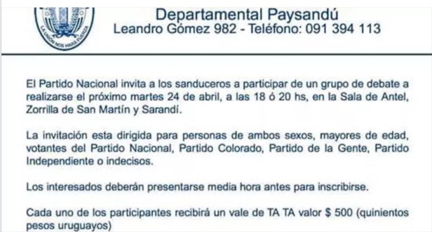 Ante comunicado surgido en Paysandú, por el cual se estaría convocando a un «debate», organizado por una Consultora privada y los supermercados Ta-Ta, el directorio del Partido Nacional emitió una declaración.