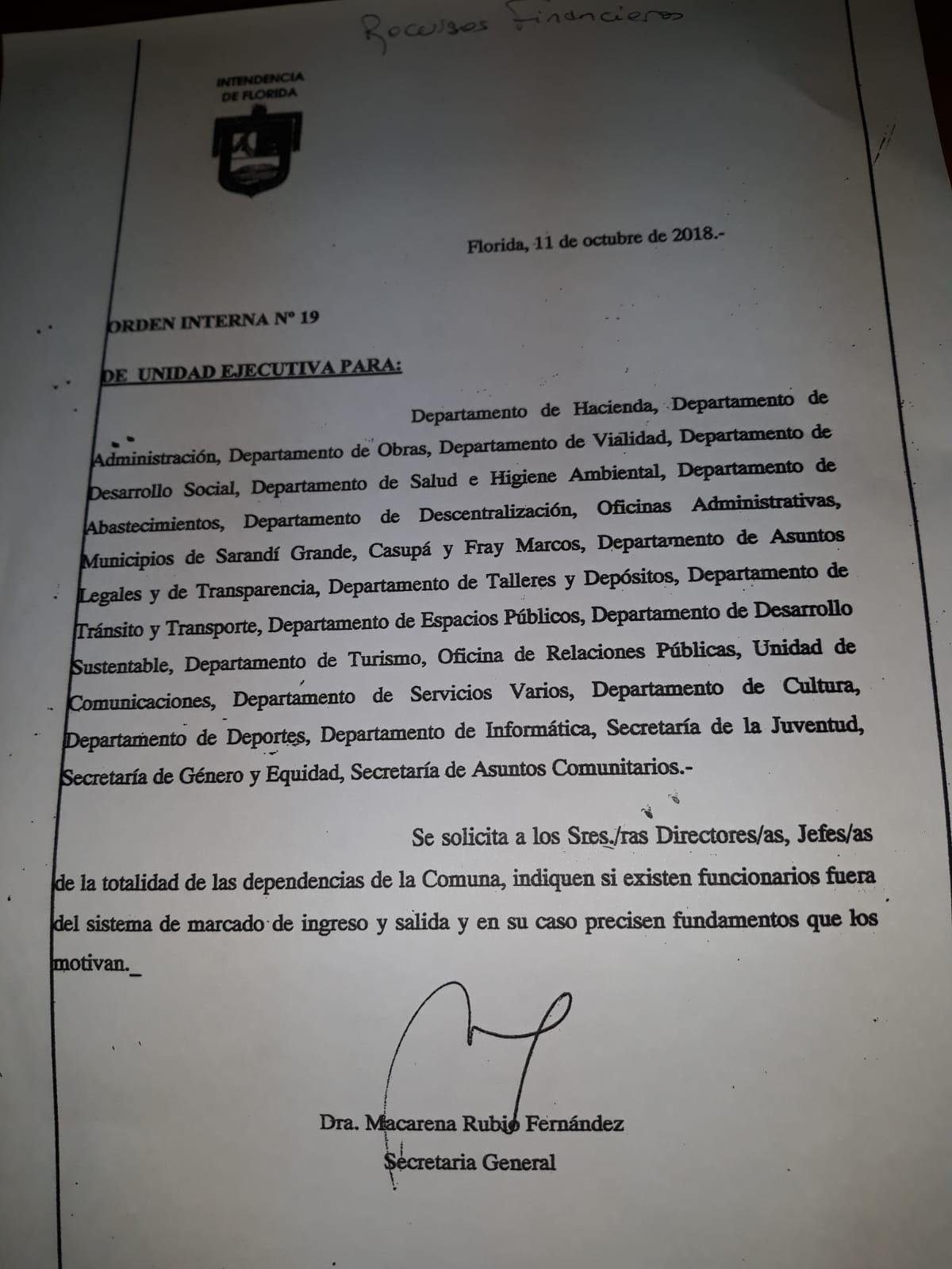 La intendencia de Florida solicitó a todas las oficinas enviar un reporte de asistencia de cada uno de los funcionarios. Y, lo que es peor, consulta si hay funcionarios que no estén concurriendo a trabajar.