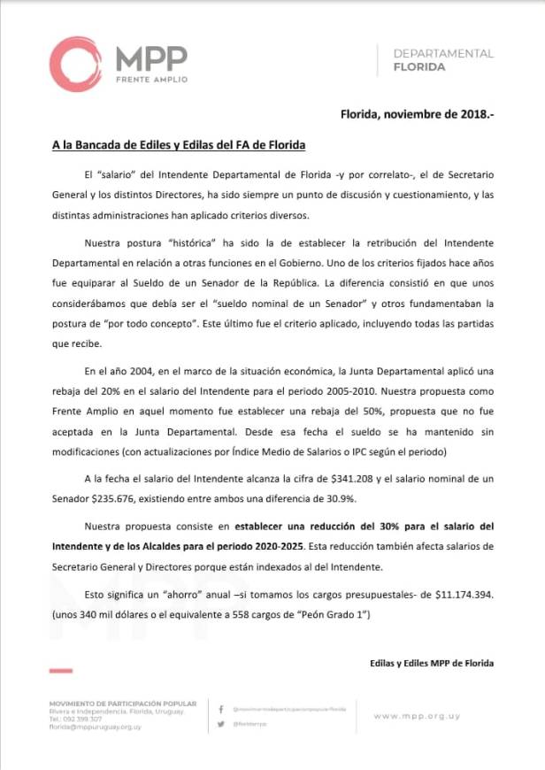 Lo que sigue, es la nota presentada en el deliberativo comunal. Actualmente, el salario del intendente de Florida asciende a los 341.208 pesos uruguayos, es decir, más que el de un senador, y el de los jerarcas, ajusta porcentualmente a ese salario.
