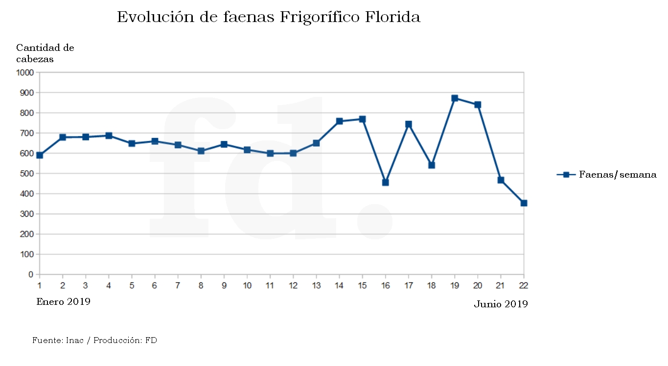 De acuerdo a los registros de INAC; la principal caída de la faena se produjo la última semana, cuando la operativa disminuyó a una producción semanal de 353 cabezas.