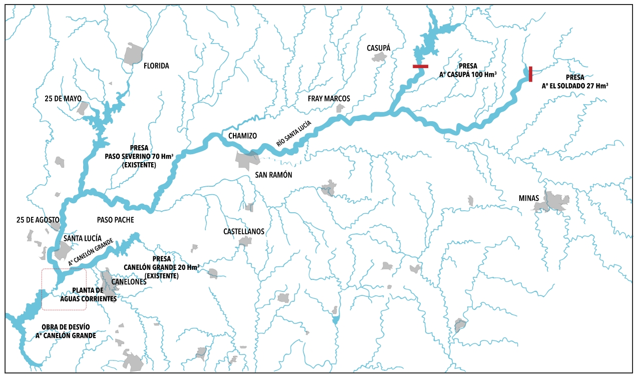 Así, la Presa de Casupá se ubicaría sobre el arroyo de igual nombre, afluente del río Santa Lucía Grande, almacenando 100 hm3 (30 más que Severino) e interceptaría una cuenca de 685 km2. El área aproximada de expropiación es de 3.600 há.