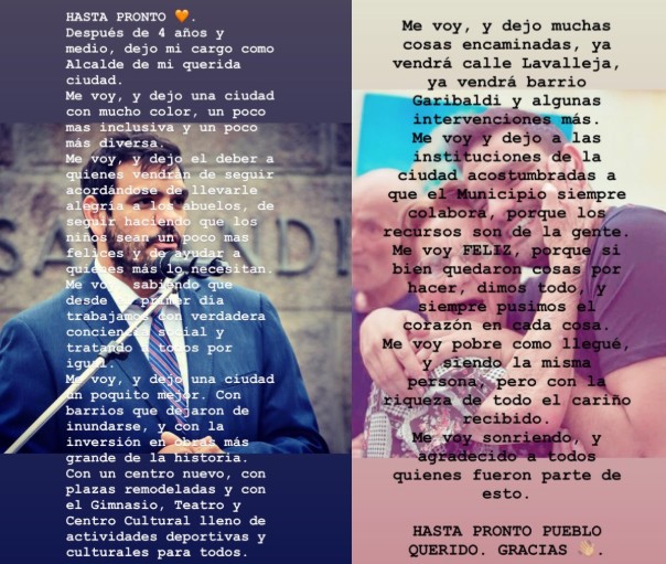 “Me voy feliz porque si bien quedaron cosas por hacer dimos todo y siempre pusimos el corazón en cada cosa. Me voy pobre como llegue, siendo la misma persona, pero con la riqueza de todo el cariño recibido. Me voy sonriendo y agradecido a todos los que fueron parte de esto. Hasta pronto pueblo querido. Gracias”.