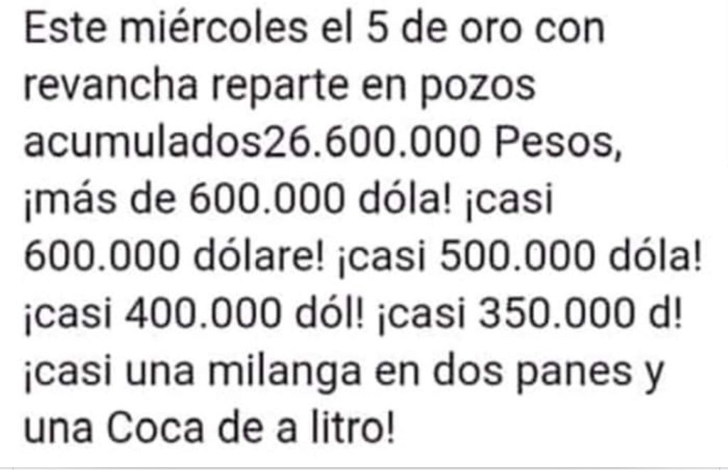 “Se necesita persona despierta e instruida para atender quiosquito que se especializa en levantar apuestas al CINCO DE OROS.”
