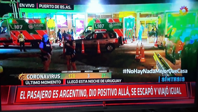 El alerta emitido por la oficina de Migraciones de nuestro país terminó por redondear el cuadro de alarma, y el operativo conjunto de Prefectura Naval Argentina y Sanidad de Frontera a la llegada del «Juan Patricio» impidió el desembarco de los pasajeros. Dicho aviso indicaba que en el pasaje se encontraba un hombre que se había fugado de un centro sanitario de la ciudad de Colonia, mientras se lo analizaba como sospechoso de coronavirus.