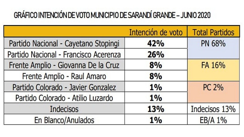 La encuesta como punto de partida, puede asegurar la victoria del Partido Nacional en las elecciones municipales en Sarandí Grande, y de confirmarse la candidatura del ex Alcalde Cayetano Stopingi, lo ubica con un alto favoritismo ante su opositor.