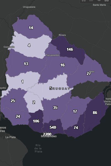Los departamentos con casos activos al día de hoy son 18: Artigas, Canelones, Cerro Largo, Colonia, Durazno, Flores, Florida, Lavalleja, Maldonado, Montevideo, Paysandú, Río Negro, Rivera, Rocha, Salto, San José, Soriano y Tacuarembó.