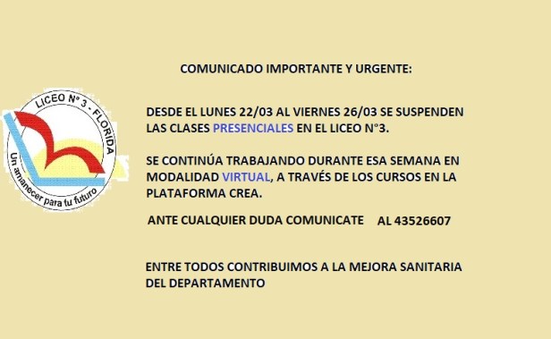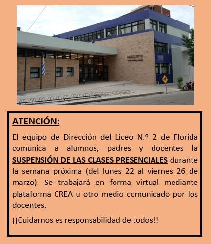 «El Liceo permanece abierto con Equipo de Dirección y demás funcionarios. Las clases presenciales se suspenden pero serán dadas en forma virtual».Además, indicaron que ante problemas en la virtualidad, se podrá acudir a la institución para solucionar el problema.