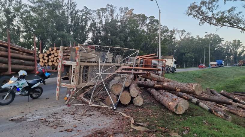 El camión volcó toda de carga de transporte de madera que pasan por el lugar en forma intensa con destino al puerto de Montevideo.