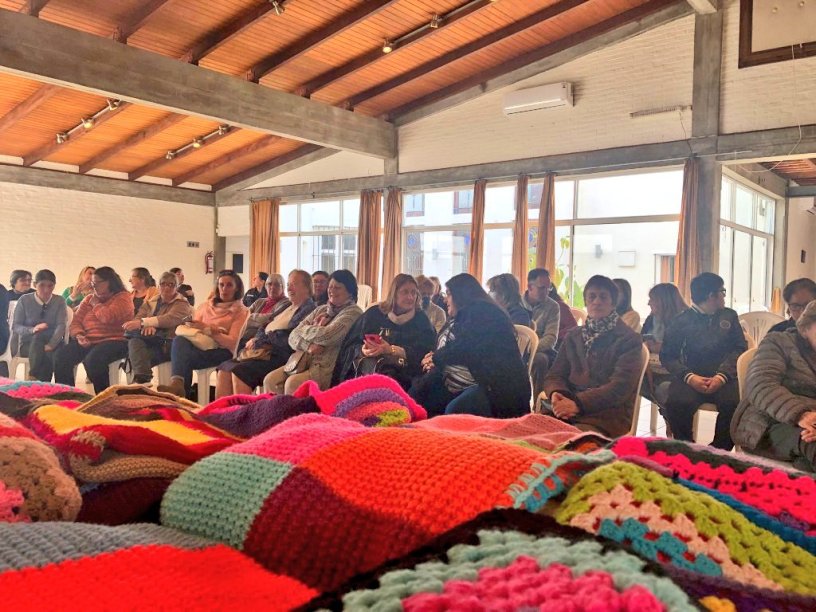 Un importante número se hizo presente en el salón principal para recibir el reconocimiento del gobierno departamental por su aporte desinteresado a esta campaña en la cual se tejieron numerosas mantas elaboradas con coloridos cuadraditos de lana a partir de miles de ovillos.