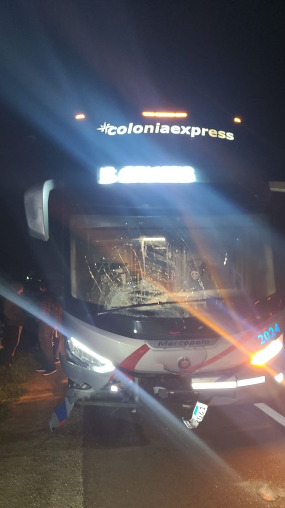 El ómnibus circula en dirección a Montevideo con 63 pasajeros, cuando embiste a un auto por alcance, resultado lesionado el único ocupante del auto; todos los ocupantes del ómnibus ilesos.