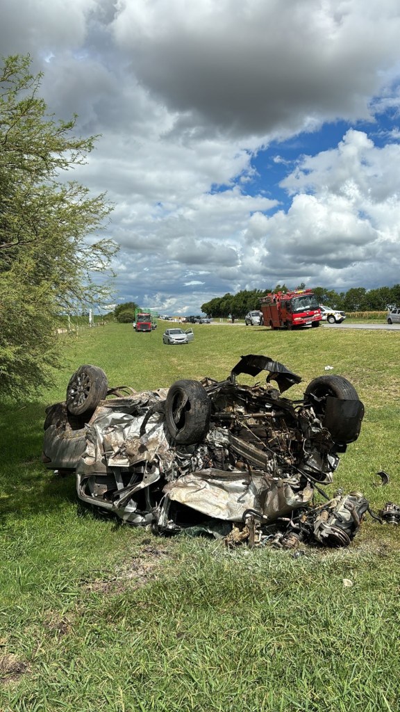 En un trágico incidente vial ocurrido hoy, un automóvil Ford Comet se desplazaba de sur a norte, colisionando frontalmente con una camioneta Fiat Strada que transitaba en sentido contrario. El automóvil quedó en la senda de circulación, mientras que la camioneta quedó en posición invertida en la faja natural.