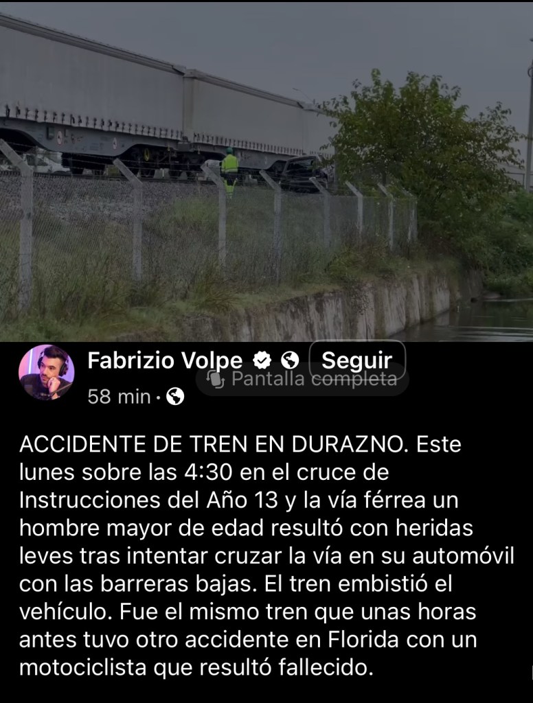 Horas más tarde, en la madrugada del lunes, el mismo tren se vio involucrado en otro accidente, esta vez en Durazno, según indicó el periodista de ese departamento, Fabrizio Volpe.