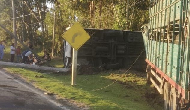 Un ómnibus de la empresa Tala Pando, que realizaba una detención para recoger pasajeros, fue embestido en la parte trasera por un camión con zorra cargado de ganado. El impacto provocó el vuelco del ómnibus, dejando a varias personas lesionadas, adelantó Policía Caminera.