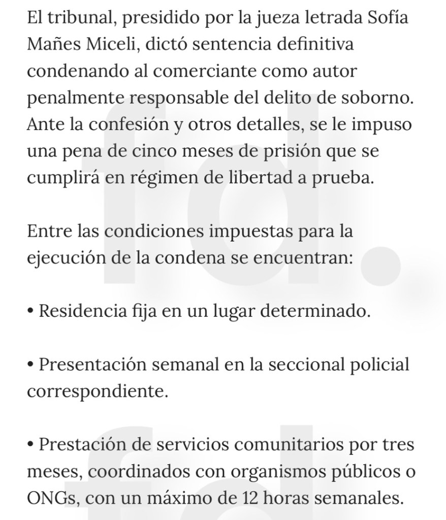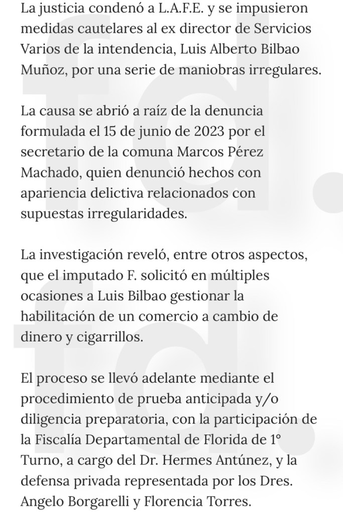 FLORIDA Condena a un comerciante por soborno y cautelar para Bilbao Fecha: 13/03/2025Autor/a: FD 0 Comentarios La denuncia la realizó la intendencia de Florida. COMPARTE! Comparte en Facebook (Se abre en una ventana nueva) Facebook Compartir en WhatsApp (Se abre en una ventana nueva) WhatsApp Compartir en X (Se abre en una ventana nueva) X Compartir en LinkedIn (Se abre en una ventana nueva) LinkedIn Compartir en Telegram (Se abre en una ventana nueva) Telegram Imprimir (Se abre en una ventana nueva) Imprimir Me gusta Cargando... Relacionado