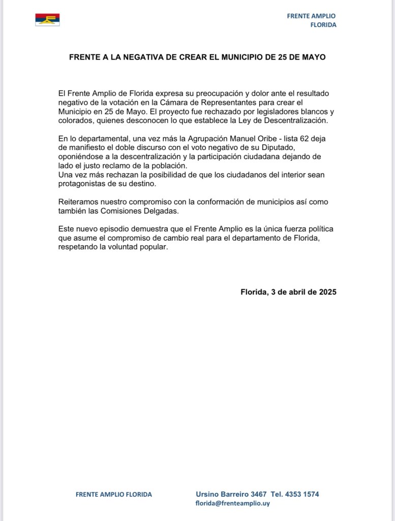 La reciente votación en la Cámara de Representantes dejó un sabor amargo en el Frente Amplio de Florida, que expresó su “preocupación y dolor” tras el rechazo del proyecto que buscaba la creación del Municipio de 25 de Mayo.