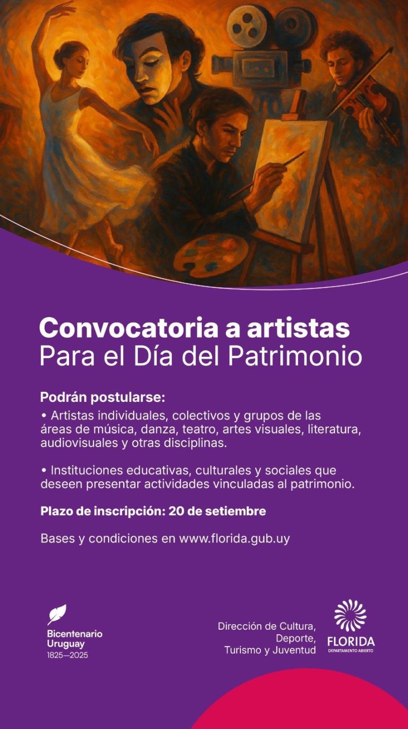 La Dirección de Cultura de la Intendencia de Florida abrió la convocatoria a artistas locales para integrar la programación del Día del Patrimonio 2025, que se celebrará los próximos 4 y 5 de octubre en todo el departamento.