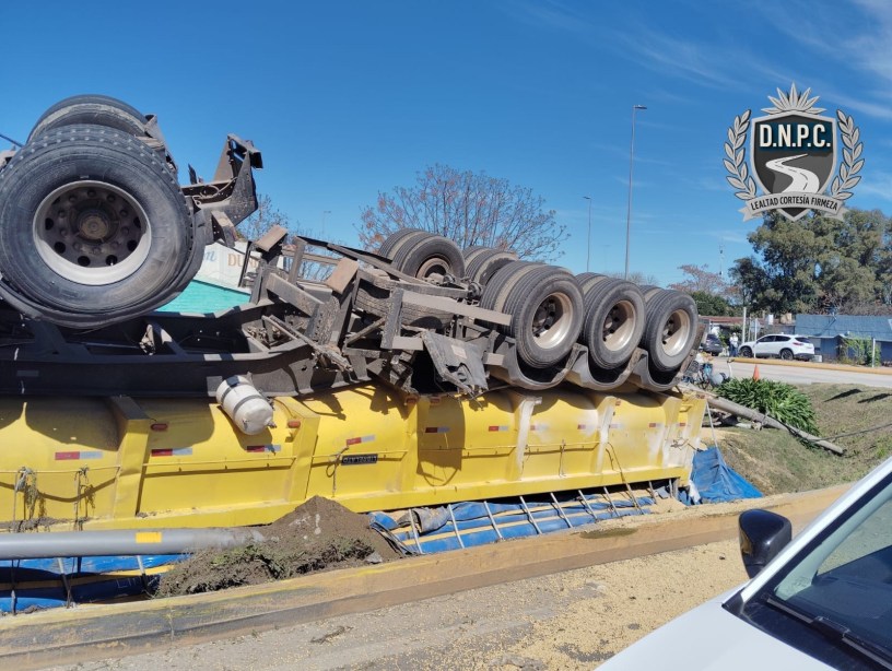 Por causas que aún se investigan, el pesado vehículo perdió el dominio, despistó y volcó sobre la rotonda, quedando en posición invertida. Como consecuencia, parte de la carga de soja que transportaba se desparramó sobre la calzada, generando dificultades en la circulación.