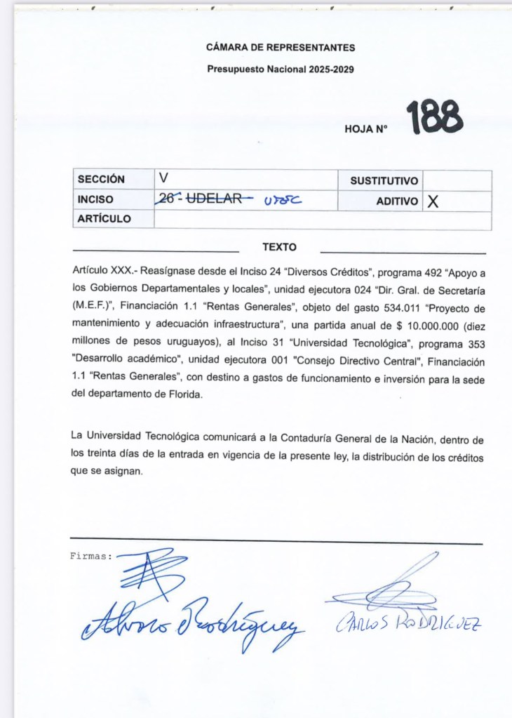 Uno de los logros más significativos fue la reasignación de una partida anual de 10 millones de pesos uruguayos desde el Inciso 24 “Diversos Créditos” hacia la Universidad Tecnológica (UTEC). Estos fondos estarán destinados a gastos de funcionamiento e inversión para la sede de Florida, fortaleciendo su infraestructura y capacidades académicas.
