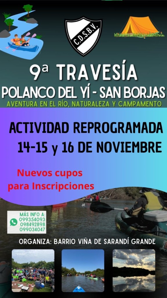 La organización de la 9ª Travesía Polanco del Yí – San Borjas informó con pesar la suspensión de la actividad prevista para este fin de semana, debido al alto nivel del río Yí, que se encuentra actualmente 2,5 metros por encima del nivel de seguridad establecido para poder realizar la travesía con normalidad.