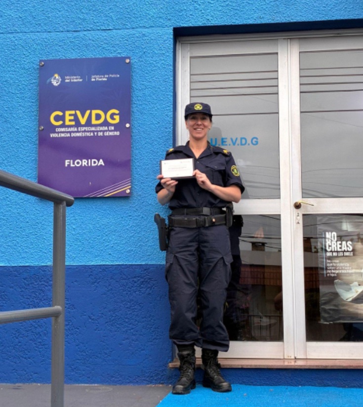 Entre los homenajeados se destacó la Sargento Nazarena Fierro, integrante de la Comisaría Especializada en Violencia Doméstica y de Género (CEVDG) de Florida, quien recibió un reconocimiento por su entrega, profesionalismo y sensibilidad en el abordaje de situaciones especialmente complejas, contribuyendo de manera significativa a una sociedad más justa y libre de violencia.
