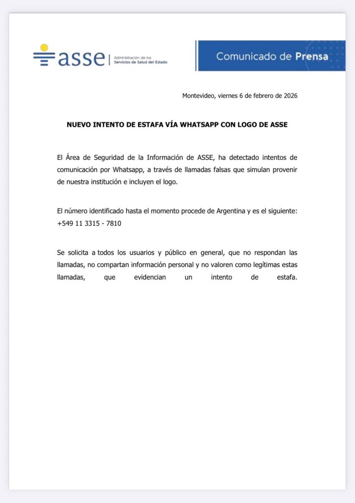 La Administración de los Servicios de Salud del Estado (ASSE) emitió un comunicado alertando a la población sobre nuevos intentos de estafa a través de WhatsApp, mediante llamadas falsas que simulan provenir de la institución e incluso utilizan su logo oficial.