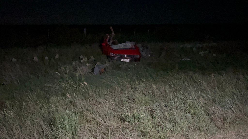 Tras la colisión, la camioneta continuó su trayectoria, salió de la faja de rodamiento, atravesó un alambrado e ingresó a un campo, recorriendo entre 300 y 350 metros campo traviesa hasta detenerse.